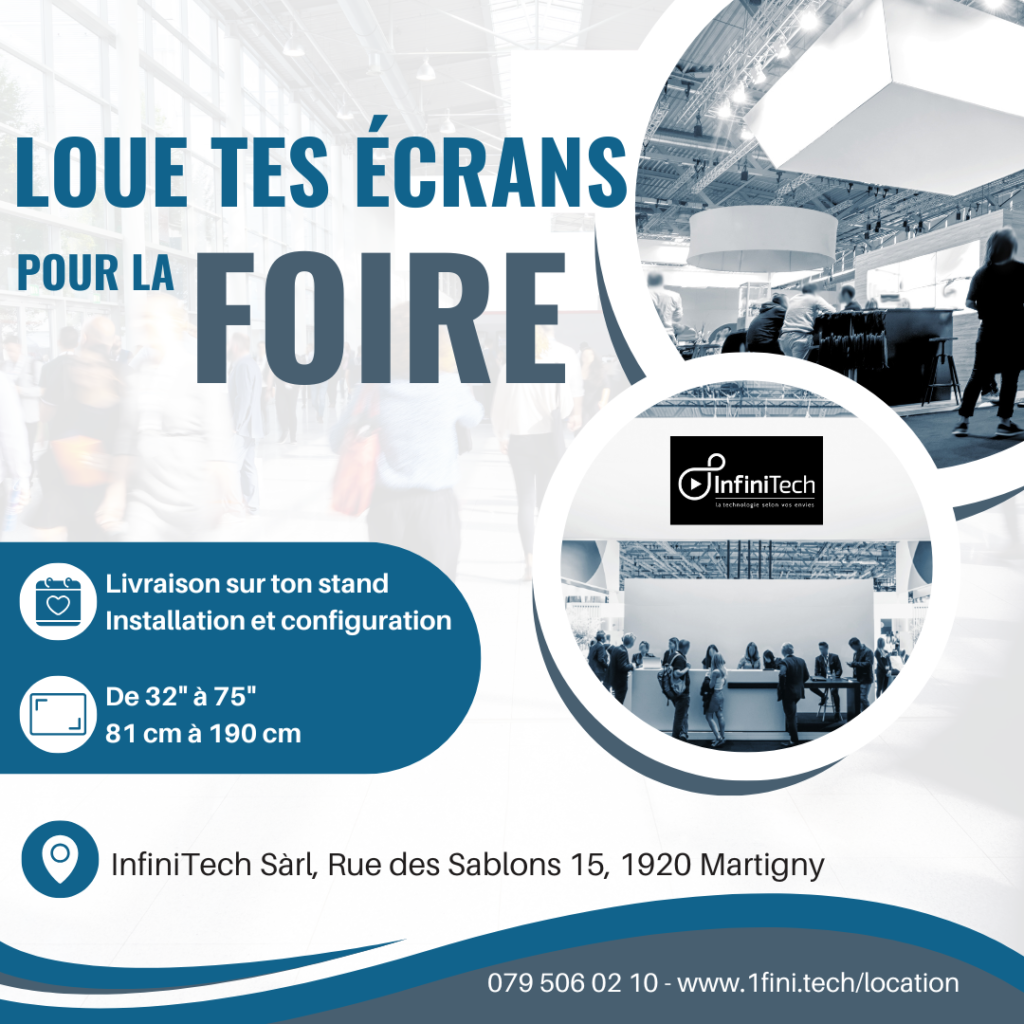 Que vous organisiez une réunion d’entreprise, un mariage ou un stand à la Foire du Valais, InfiniTech met à votre disposition des écrans de 81 à 190 cm, disponibles à la location pour toutes les occasions.